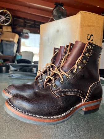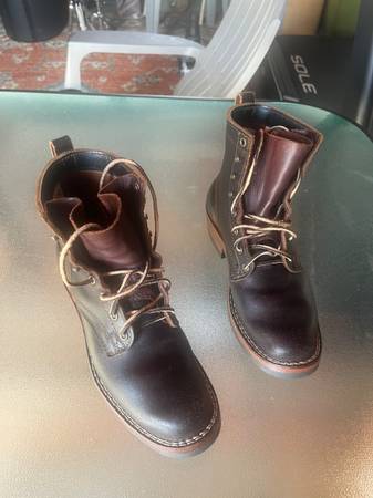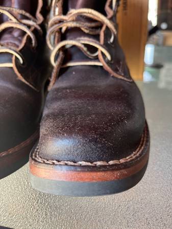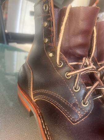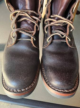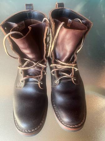 “Robert” bought in 2023, brown waxed flesh in a size 7C, 6” high, antique hook and eye color, Vibram V-bar sole, dogger heel, natural finish edge, soft toe, pull loops, leather laces, excellent...