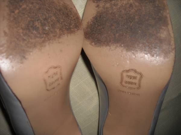 Good heel tips. Minor scuff in the leather on the back of the right heel, towards the bottom.