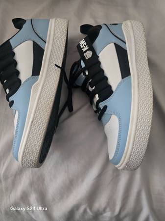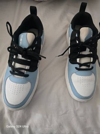 Selling slightly used womens sneakers, size 8, K-Swiss. They are in great condition. They are baby blue, black and white.