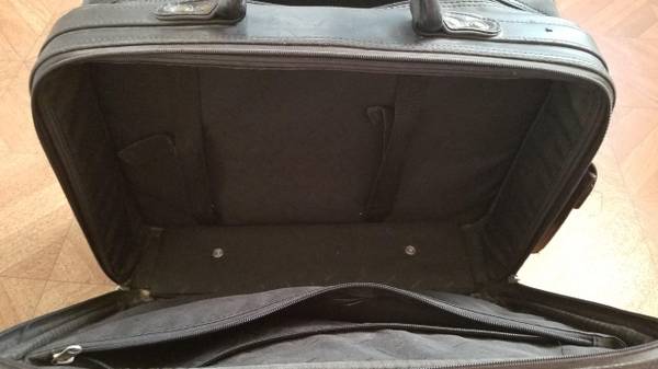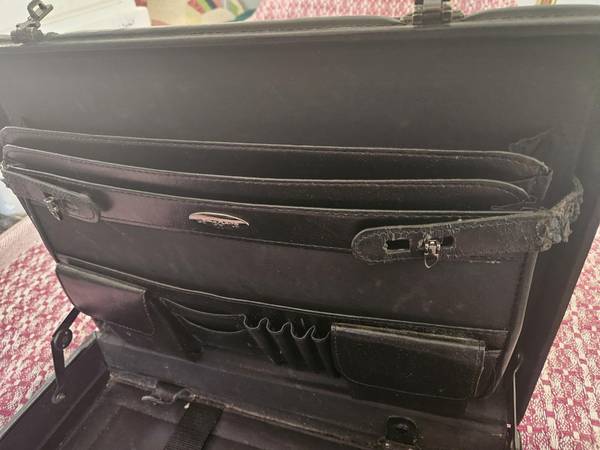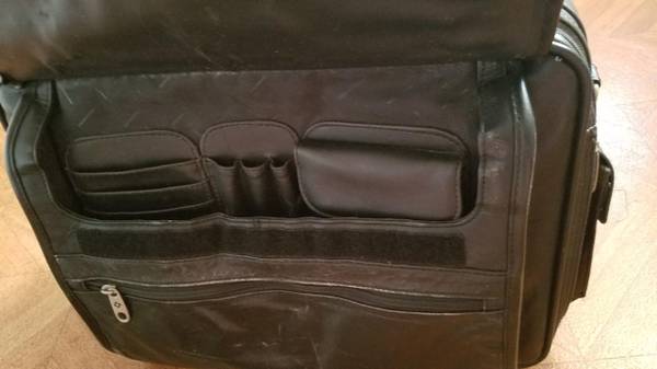 1 with a zippered pocket inside and straps to secure laptop and dividers in the other