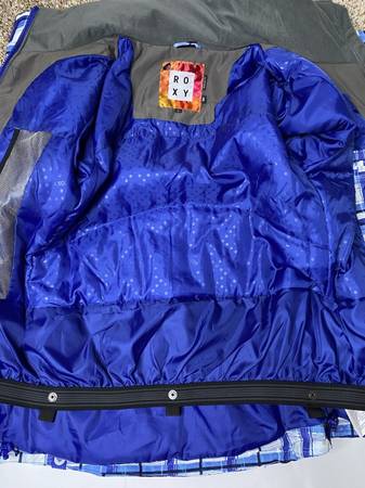 Like New Roxy Womens sz Small Snowboard Ski winter jacket in nice blue, navy blue, black and white.