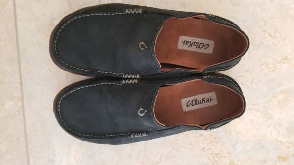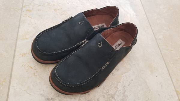 Great Olukai Moloa slip on casual shoes in nice dressy black/toffee leather, excellent with slight wear to the soles.