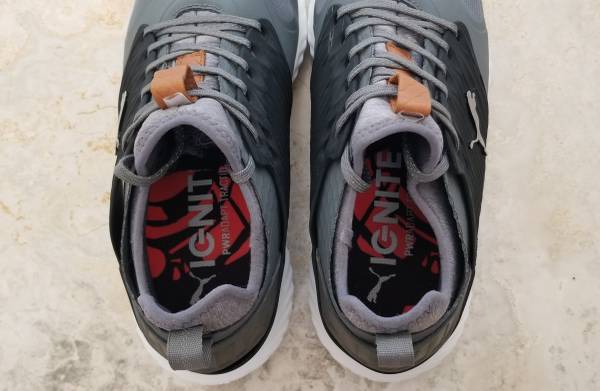 Like new Puma Ignite PWRAdapt Golf shoes in nice light Grey, waterproof, worn once and cleaned, and barely any wear on the bottom spikes, so you won't be disappointed in the like new condition!
