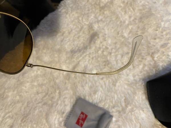 Ray-Bans are used but in good condition. There are some areas where the gold metal frame and the gold metal cross bar have been bent or mis-shaped but minor (the frame can be straightened by Ray-Ban or any eye glass shop) please see the pictures!