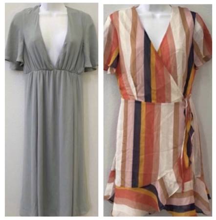 women’s dresses available - individually priced at $12 each left to right: 1. Show Me Your Mumu sage green bridal midi size M (brand new with tags) 2. All in Favor Isabella striped wrap mini size M...