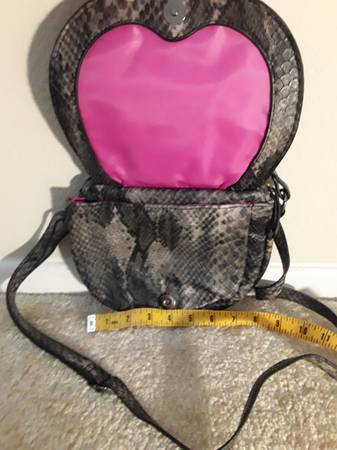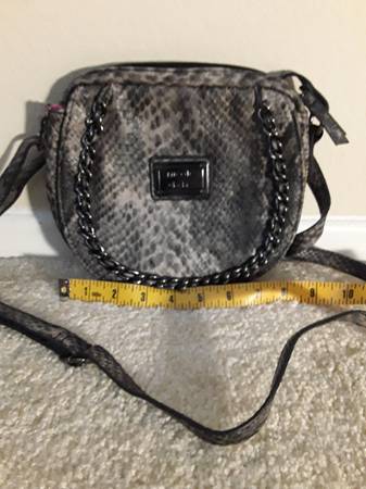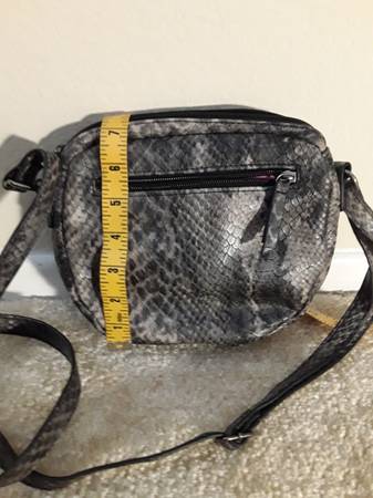 Greyish Black purse for $13 firm, measures approximately 8" tall by 9" wide. There is a mistake with the stitching, you can see in the pic, which is why I'm selling for only $13.