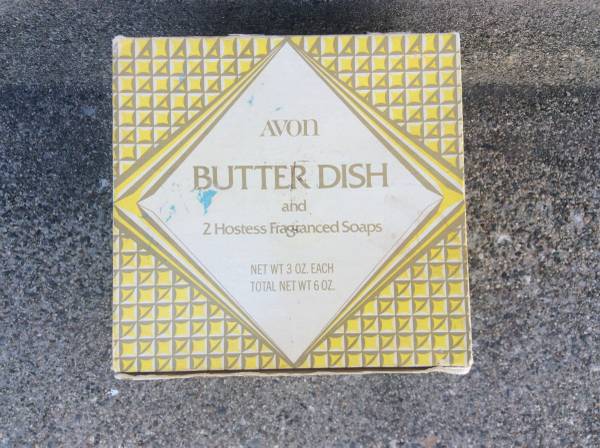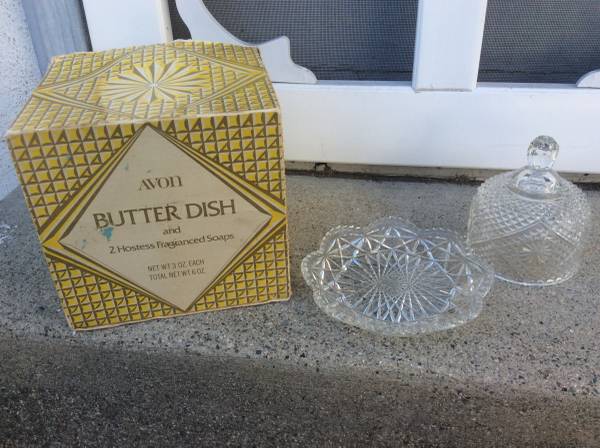 Vintage Avon butter dish from the 1970's in its original box. The box has seen better days, however the butter dish itself is in excellent condition. Originally used as a hostess gift from Avon, this dish originally had two soaps included. The soaps are NO LONGER INCLUDED. The box measures 7"W x 7"L x 6 1/2"H. The butter dish base measures 6 1/4" across and sits .75"H. The dome measures 3 3/4"W x 4 1/2"H. Beautiful heavy cut glass, this displays very elegantly. I've heard that this can also be used as a cheese dish. From a smoke-free home. Cash only please. Call (landline phone -leave a message if there is no answer) or e-mail. Preferred method is e-mail. To see more items that I have up on Craigslist, click on the "more ads by this user" link located under the map at the top right corner of this page.