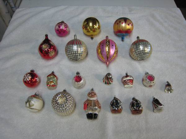 Collectible glass Christmas ornaments. Some 50+ years old. Some are obviously European origin. Others from the 60's-80's. All are glass. Some from when I was a little, and I'm old!. All are in good condition with their loop hangers. The entire lot of 53 ornaments is $125.00 cash.
