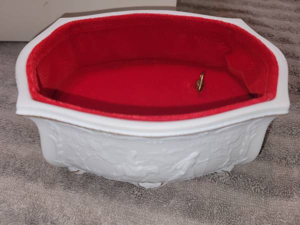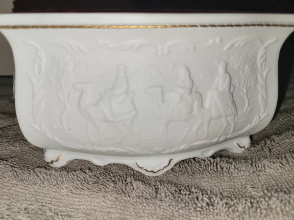 The Nativity music box by Lenox dated 1992. Plays the tune Away in a Manager. Winding key and on/off switch are located inside of the red velvet lined interior. Outside is made of a bisque porcelain. Relief decorated with The Nativity on the lid, Angels proclaiming on high on the end panels with the trek from Nazareth on the donkey and the trek of the three wise men on the longer sides.