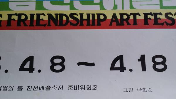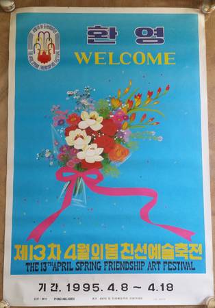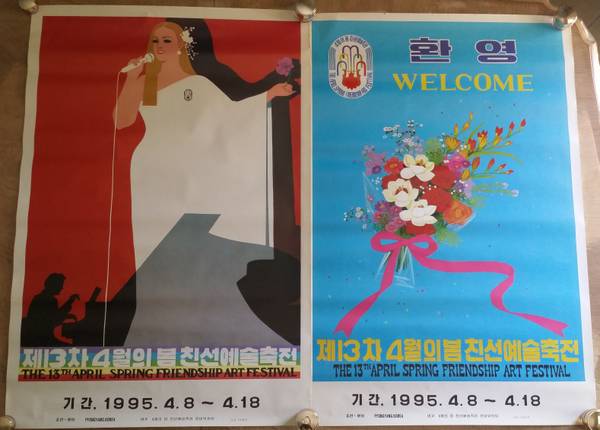 Everything that comes out of North Korea can be considered propaganda--whether it be political, military, or cultural. These 2 large posters fall into the cultural category, and are undoubtedly the only original artworks that exist in the entire Western Hemisphere from the “13th April Spring Friendship Art Festival” held in Pyongyang in 1995.