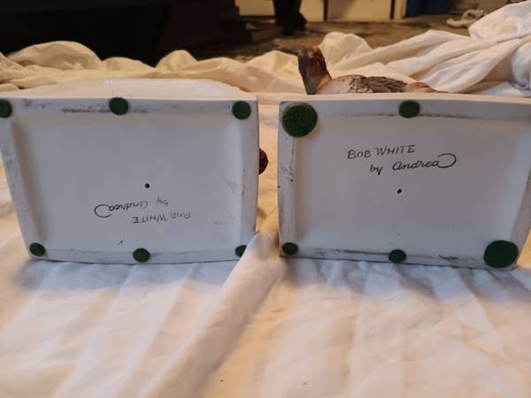 Bookends of two birds perched and sitting with one looking forward and the other looking off to the left. Both in great shape and are Bob White by Andrea bookends. Cash or credit card only.