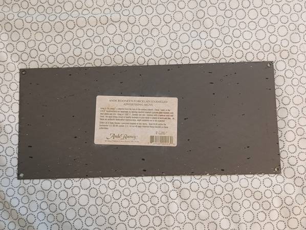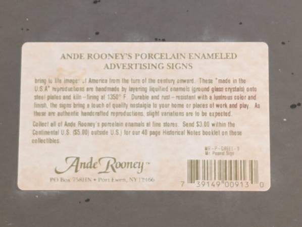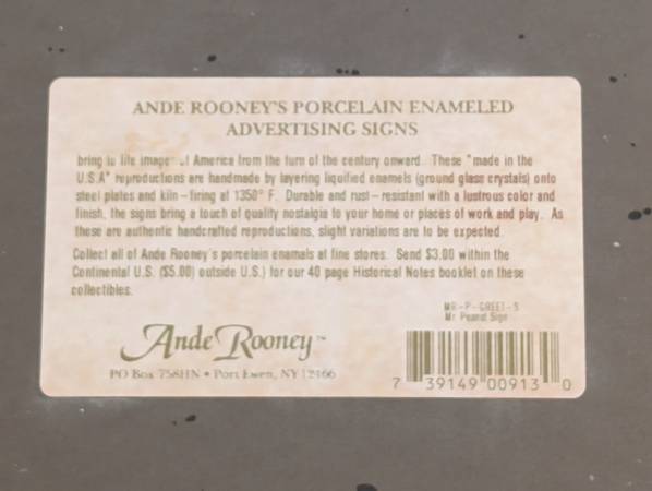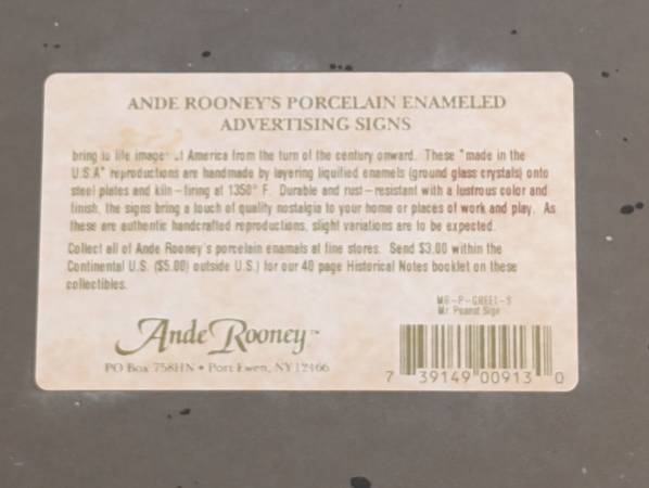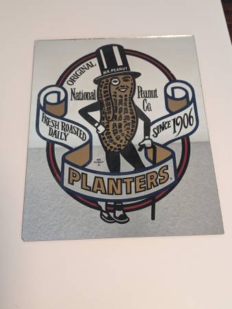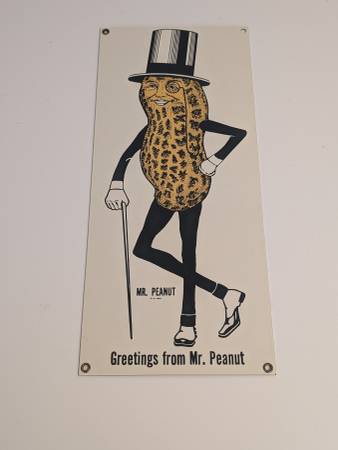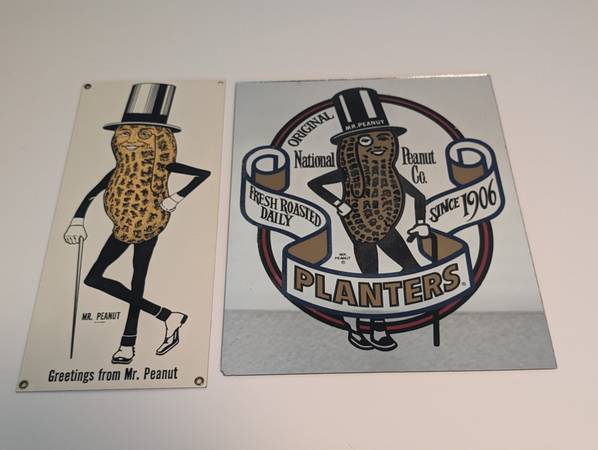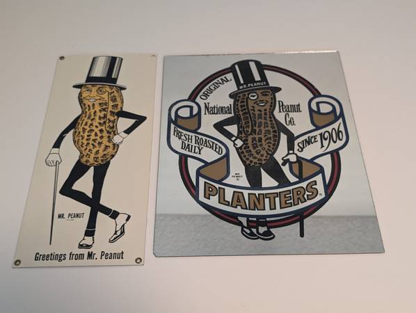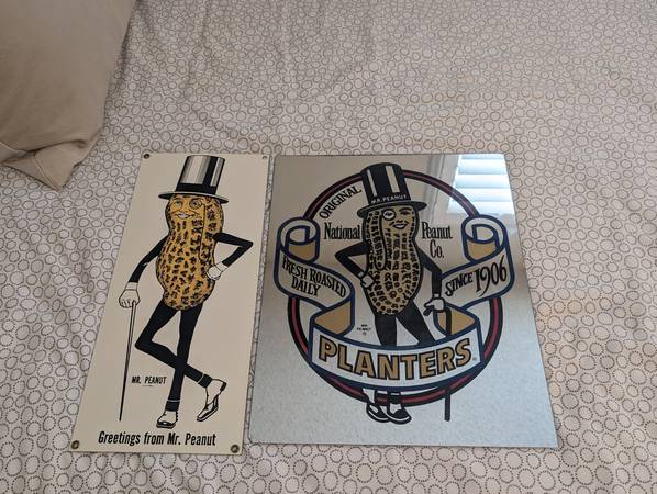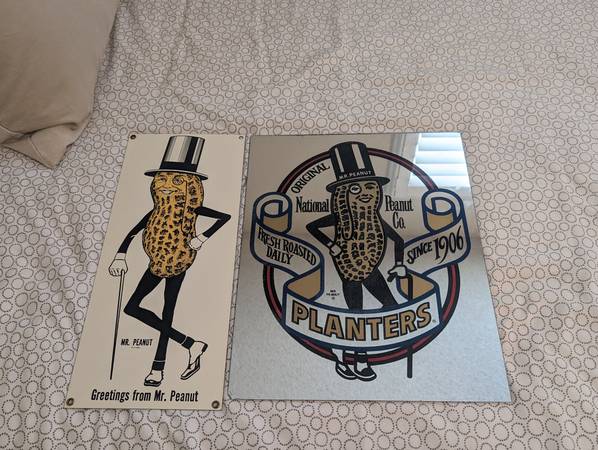I have the following items for sale: Planters Peanuts - Mr. Peanut Mirror and Porcelain Enamel sign lot. The mirror is from the 1980s (15''x12''), and the sign is a 1993 Ande Rooney Planters Mr. Peanut Porcelain Enamel Advertising Sign (7 x15 1/2").