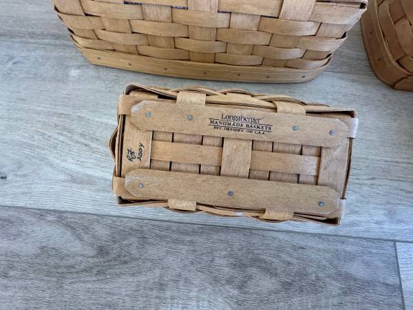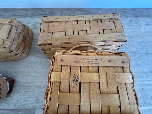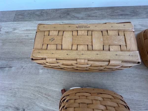 Longaberger craftsmanship in versatile woven baskets. All made within 2002-2005, These pieces(4 in total) 2 of the Baskets include two original plastic protectors, all include cloth liners. 1 basket is finished with double handles featuring leather grips and other with coppers grommets with wood handles, all woven in the style Longaberger is known for. all baskets are signed.