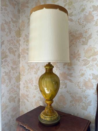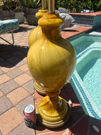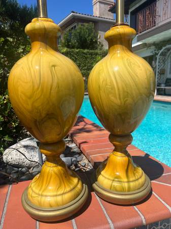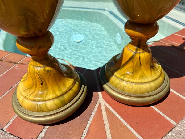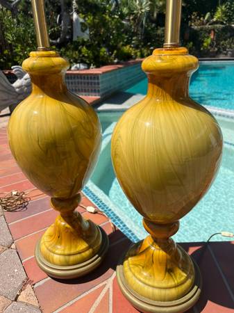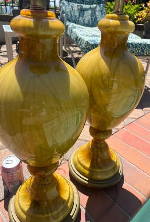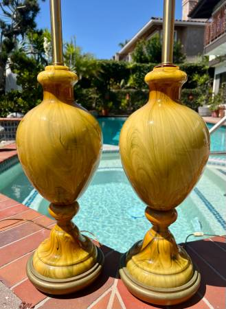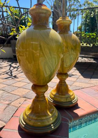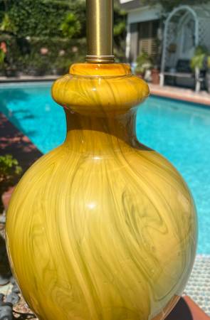 Striking pair of Mid-Century table lamps by Marbro Lamp Company, featuring large, swirled yellow and green Murano glass bases. The handblown Italian glass is set upon a refined gold-tone base. Assembled with custom hardware in Marbro's Los Angeles workshop, these lamps represent the high-end artistry and sought-after designs the company was known for. Highly collectible, with similar pieces demanding thousands. There are remnants of the original silver and black label still attached. I have included a sample of the original label so you can compare. Condition: Excellent vintage condition with minimal age-appropriate wear. Free from cracks or breaks. Some tarnish on the brass elements of the lamp neck and metal parts of the lampshade. Measurements: 41" H (to top of original finial), 32" H (to top of socket), 22" H (glass base), 9" D (base). Original Shades: Included, measuring 18" H x 14.5" D. CASH AND PICK UP ONLY