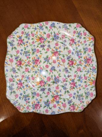 A collectible plate by Royal Winton in the Old Cottage Chintz style. The plate is available for pickup only. No delivery.
