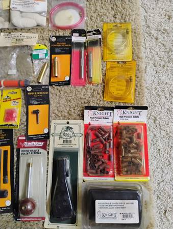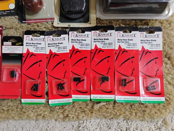 I have a great deal of black powder items for muzzle loading capability. 7 Rear sites, pellet flask, percussion discs, powder measuring device, patches, etc. Etc... please look at the pictures to see a ton of items included. Thank you very much pick up in Irvine
