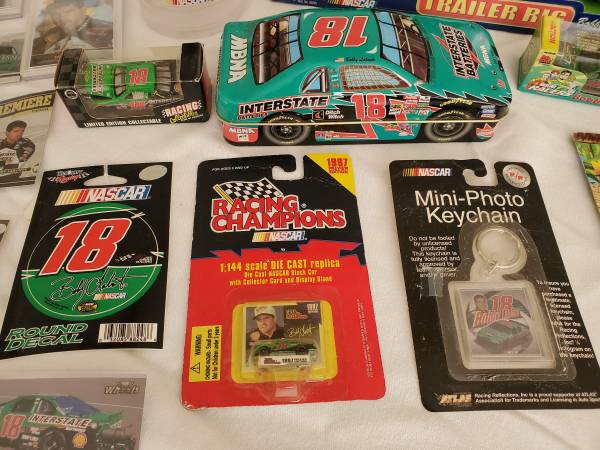 Collection of Bobby Labonte #18 Interstate Batteries NASCAR items including diecast cars, trading cards, sticker, tin, keychain, and more. Selling all at once.
