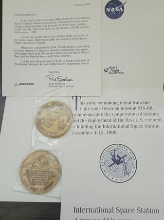 a) Space Flight Awareness coin, contains