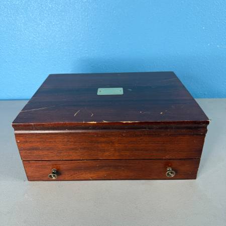 The original mahogany chest is included. Interior velvet is clean. The exterior shows vintage wear (light scuffs, minor fading). One front knob is loose, and one back hinge is non-functional but easily repairable. The chest opens and closes securely and displays the set beautifully.