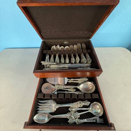Wallace Grand Baroque flatware set, sterling silver service for 12, 85-piece Wallace sterling silverware, Grand Baroque silver with original chest, vintage Wallace sterling no monogram, ornate baroque sterling silver flatware, antique heirloom flatware set, collectible Wallace silver utensils.
