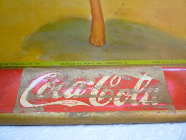 A vintage Coca-Cola serving tray from 1937 depicting a model in a bathing suit running on the beach. Coca Cola Co 1937, America Art Works Coshocton, Ohio. A Coca Cola original advertising...