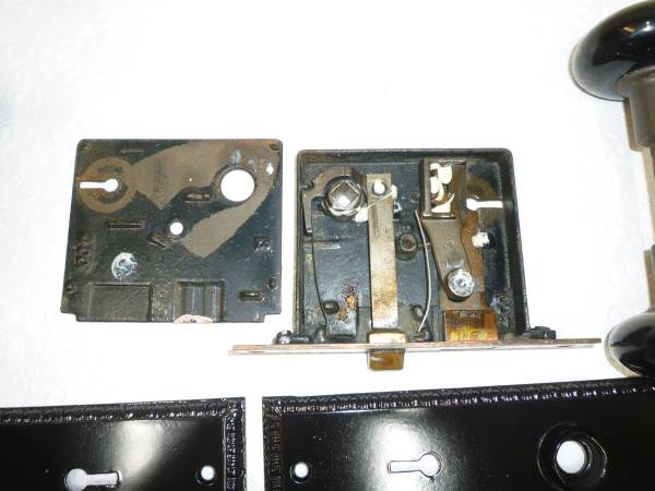 Early 1900's Two pair of black glass doorknobs. Both matching backplates have period design of 'egg and dart' Working full mortise locking mechanizm lubed, tested and ready to install Skeleton key...