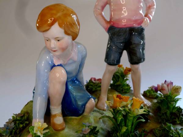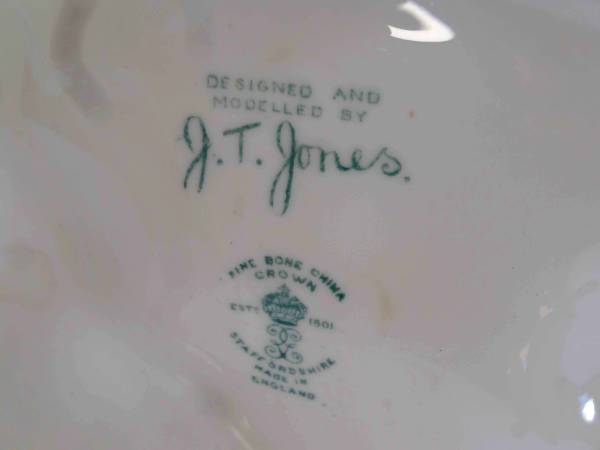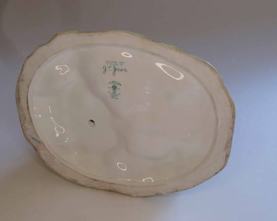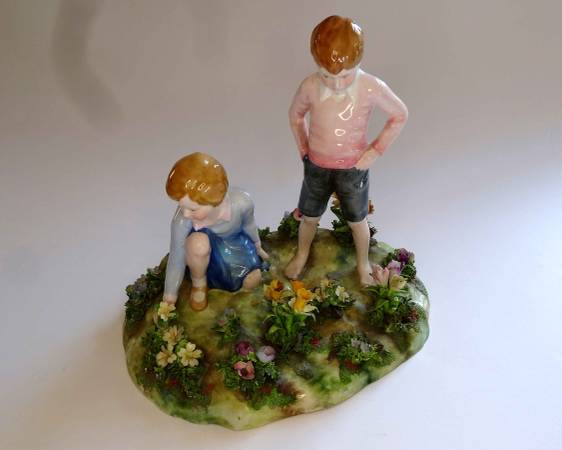 Offered for sale, a rare and beautiful creation "Designed and Modelled" by J T Jones. Stamped on the bottom of the piece is "Fine Bone China, Crown, Staffordshire, Made in England." The image is of two children in a garden of flowers with intricate detail and delicate arrays of flowers and leaves. The total height is roughly 9.5" with a base of roughly 9" x 7" in an oval shape. The piece has been in our family for over seventy five years and is still is good condition. Now downsizing, the hope is for another caretaker to value this work of art for years to come. Fairly priced at $25.00. Check in with Richard at show contact info