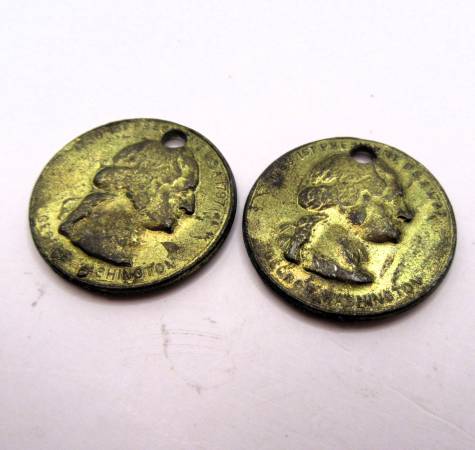For sale are two George Washington commemorative medallions, often referred to as funeral tokens or medals, which were produced to honor the first U.S. President. Used for jewelry making. The medallions feature a bust of George Washington on the obverse (front) and typically include inscriptions such as "1ST PRESIDENT, U.S.A.", the years of his presidency "1789-1797", and "GEORGE WASHINGTON". Obverse / Reverse are the same.