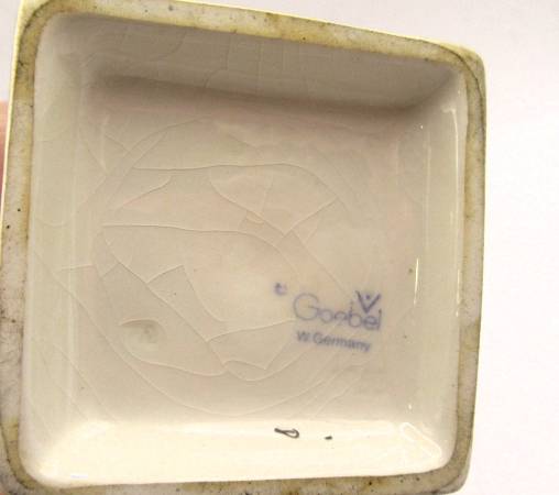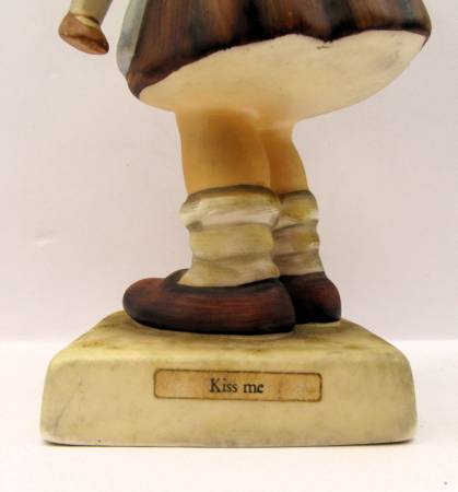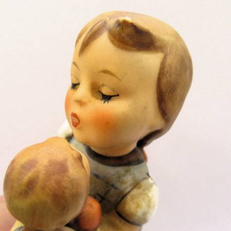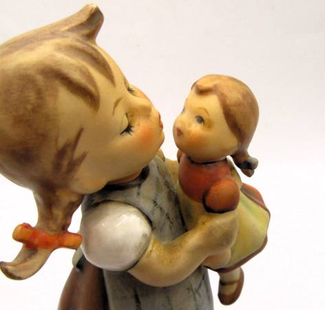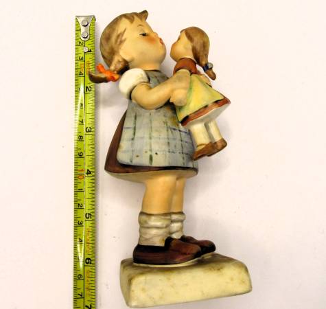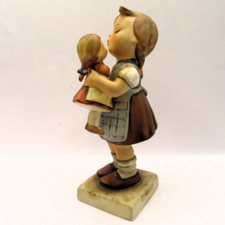 Goebel Hummel "Kiss Me" Figurine. This collectible porcelain figurine depicts a young girl in a blue and white checkered dress gently kissing her doll. The TMK-5 mark is a "V" with a stylized bee inside it, positioned over the name "Goebel". The words "W. Germany" are often stamped with this mark and was produced between 1972 and 1979. Item is hand-painted porcelain with a glazed finish and stands around 6 to 6.25 inches tall.