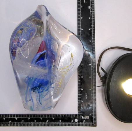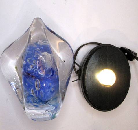 Selling a hand-blown art glass sculpture on an illuminating light base. It features an abstract design with colorful internal swirls of blue, white, and yellow glass, which is common in Murano or "Murano-style" glass art, often depicting aquatic or abstract themes. The black base is designed to backlight the clear and colored glass, making it appear to "glow from within" and highlighting the internal structure and colors. This type of lighting is a popular way to display translucent glass art, giving it a dynamic quality.