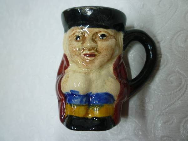 Seven Toby Mugs and characters. From 5 1/2 inches tall and 2 inches for the miniature. Royal Doulton are: Old Charlie, Capt Cuttle, Mr Micawber, The Trapper, Pedro Shorter & Son Staffordshire...