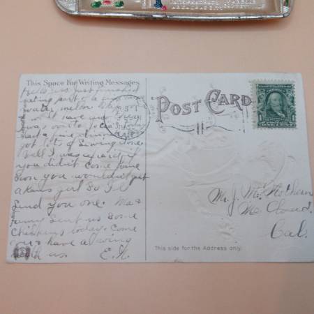 1. Vintage Postcard: Approximately 3" tall. Overall fair to good condition considering its age. There is some wear along edges. Item has been postmarked with writing on the back.