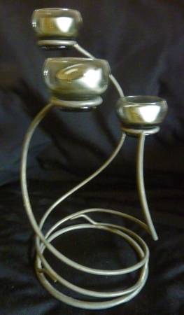 This decorative wire candle holder is in excellent condition. It holds 3 candles, which are included. The holder measures approximately 13' high (with candle installed), 6" diameter. See photos for...