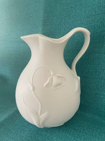 This parian porcelain pitcher features an appliqué decoration of jonquils and arching leaves rendered in high relief.