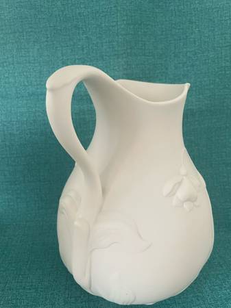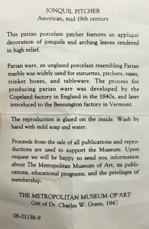 Parian ware, an unglazed porcelain resembling Parian marble was widely used for statuettes, pitchers, vases, trinket boxes, and tableware. The process for producing parian ware was developed by the Copeland factory in England in the 1840s, and later introduced to the Bennington factory in Vermont.
