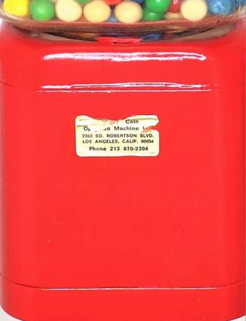 This is a RARE gumball machine from the 1950s. It features a red cast iron body, cap, and stand with a clear glass globe. The cap is stamped with the National Association for Retarded Children's (NARC) motto at the time "RETARDED CHILDREN CAN BE HELPED". The machine is filled with the original colorful gumballs from that era. The gumball machine is mounted on a pedestal with a circular base and a chrome coin slot on the front stamped "THANK YOU" with an acorn. The original brass key to lock the machine is stamped "CHICAGO LOCK CO." "CHICAGO, ILL." "MADE IN U.S.A.". This machine has a nice retro feel and is ideal to be used as a functional, decorative piece to provide a touch of nostalgia.