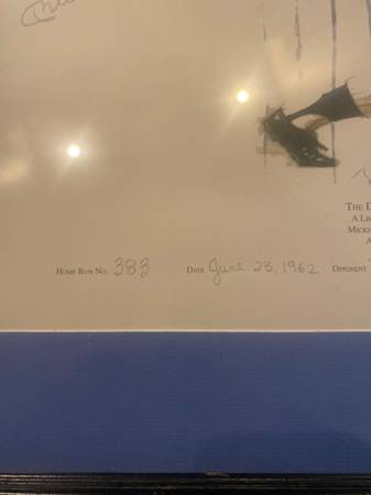This is unique item for any Mantle fan. The is a litho from the decathlon series. This depicts every single home run hit by Mickey. This one is for home run 383 out of the 536 he had hit on June 23rd of 1962 against Detroit. This has been authenticated by Global Authentics or GAI. This is framed , matted and ready to hang the measures 30 tall by 23 wide