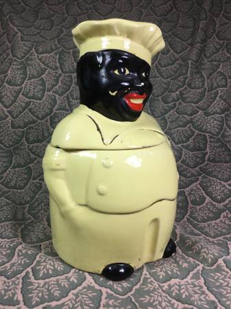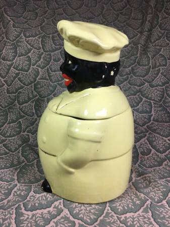 Condition: Fair/Good condition. Chip on the underside of his right shoulder (lid of cookie jar). A couple very small ones on edge of the very same. Base has a couple also at the very bottom edge. 22k gold has aged away. Some black glaze paint has come off in spots. Great restoration project!