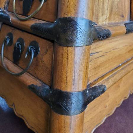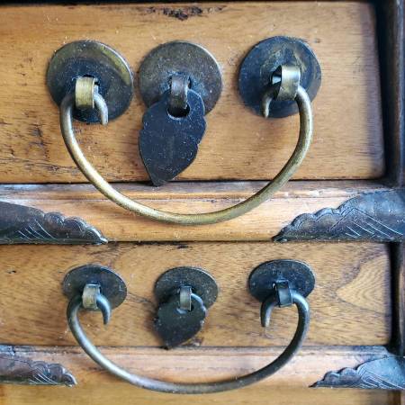 Street vendors were a common sight in ancient China and offered a wide range of services. They had to carry all their equipment and offer seating for some services like haircuts. This little bench could fulfill all these purposes and more. The widely splayed legs house four drawers with brass handles at the front. Tools could be easily stored inside. The seat at the top is beautifully decorated with brass mounts; the larger ones with ruyi ornaments and the smaller ones as butterflies. The central brass plate has a slot; this could be used like a piggy bank for customers to put money for payment and the money would end up in the top drawer.