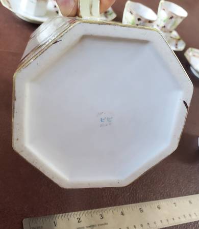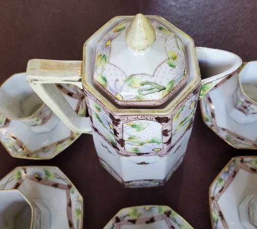 Nippon hand painted Hot Chocolate Pot w/ 5 Cups & Saucers. Pre WWII. Maker's mark and Nippon (Japan) marked Nice looking set. Well used. Nice colors with gold trim. Some of the gold trim is worn...