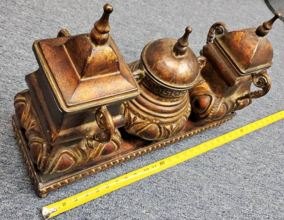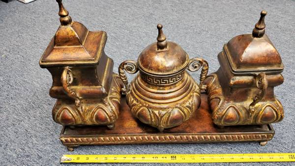 Decorative Set of 3 Larger Distressed Bronze Finished Jars/Urns on A Long-Footed Platter These were purchased from a high end retail store a few years ago. All with Lids. Excellent condition. See my...