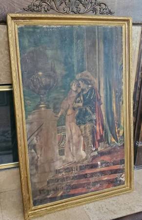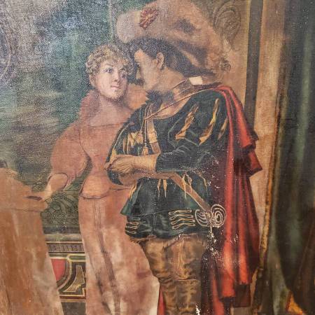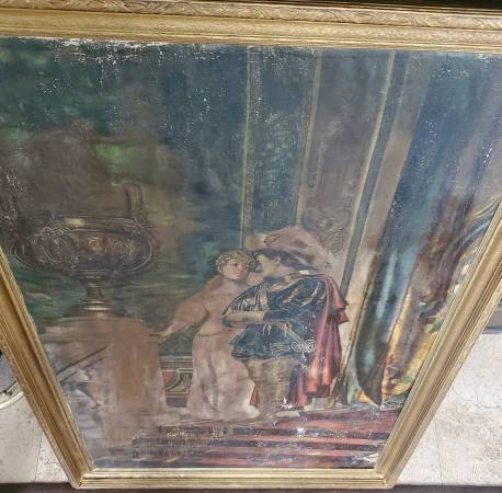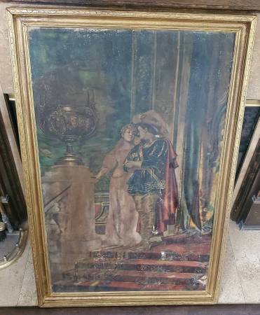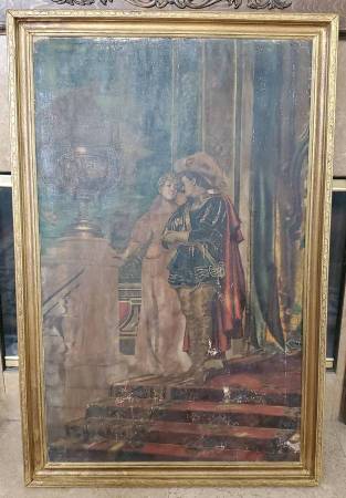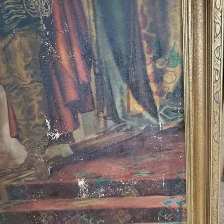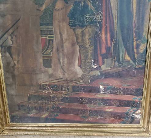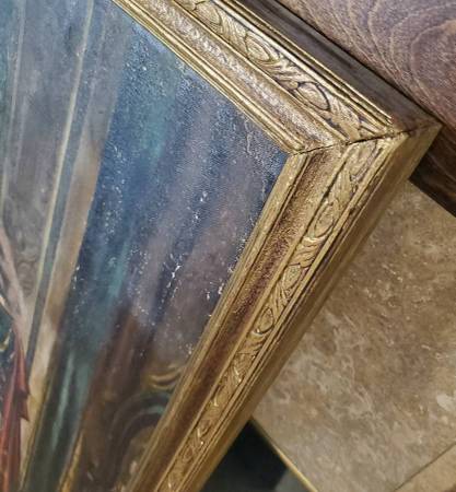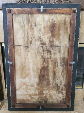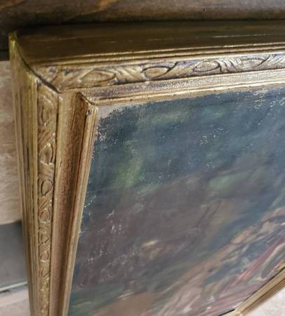 I acquired this painting from an East Coast estate and a few others with this particular one in a somewhat damaged and neglected state of condition that was likely the result of water damage (possibly a flood), long-term storage and was neglected for several decades. Painting and frame had a very thick coat of dirt/grime obscuring much/most of the detail of this beautiful painting. I have carefully cleaned this painting to the best of my ability and repaired the frame over the course of a month or two steaming the boards straight and flat. Corners, sides and bottom of frame sustained gilding loss, some chips, and the sides and lower part of wood frame were warped and twisted. Cleaning the painting revealed many areas of paint loss throughout, some canvas thinning, there is an old patch repair to canvas on the back, and a few possible touch-ups to paint from a century ago. The canvas was relined only at the edges at some time and tacked back down to the stretcher with old copper nails (probably around a hundred or so years ago). I noticed this when untacking and resetting to tighten up the stretched canvas a bit. I have made restorations to the frame by completely taking it apart and straightening the wood. I removed the rusty nails barely holding it together. Cleaned/sanded/wood filled the little bit of gold gilding that was remaining (only a little gilding remained on the top piece and upper sides of frame). Re-assembled the frame with unused old-stock nails and a few of the original ones that were still re-usable. Repainted the frame with a mixture of bright gold and antique gold paint, applying an antique wax finish. Not perfect but looks very presentable. I almost ditched this frame for a total replacement, but it all worked out OK with some minor imperfections in my opinion.