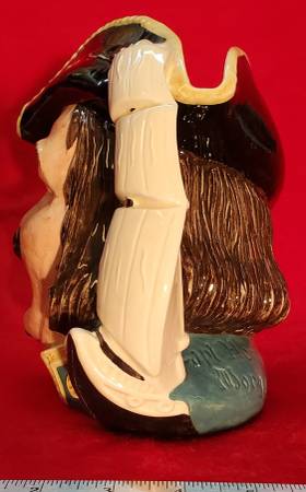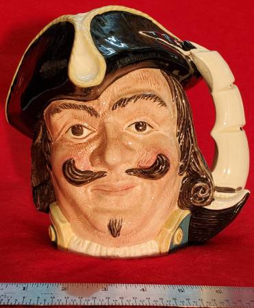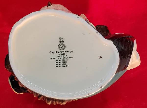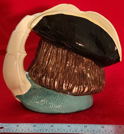 Capt Henry Morgan character jug modeled by Garry Sharpe and produced by Royal Doulton of Burslem, England, between 1958-1982. Henry Morgan (1635-1688) was a privateer who made a name in the Caribbean as a leader of buccaneers and roughnecks. In 1666 Morgan was aboard a ship that seized the island of New Providence. When the ship's captain was killed, the buccaneers chose Morgan as their admiral. Under commission from the governor of Jamaica, he pursued the Spanish, ravaged the coast of Cuba, captured and sacked Puerto Principe, and with 1,400 men defeated a much larger force than his own in taking the city of Panama on January 18, 1671. The fame of this brilliant exploit was tarnished by the habitual cruelty of Morgan's crew. The politics of the time were complex, however, and despite having previously received royal support for his actions, Morgan was arrested and conducted to England. His fortunes turned again, and in 1674 Morgan was knighted by King Charles II and made Lieutenant Governor of Jamaica, where he remained until his death. The sails of a ship form the handle of the jug. Along with this large size, a small size (D6469) and miniature size (D6510) were also produced.