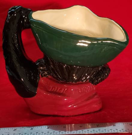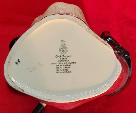 Dick Turpin character jug modeled by David B. Biggs and produced by Royal Doulton of Burslem, England, between 1960-1981. Dick Turpin (1705-1739) is possibly the most notorious of English highwaymen. Born at the Bell Inn in Hempstead, Essex, England, this infamous King of the Road began work as a butcher. However, he soon turned to such crimes as cattle poaching, smuggling and home burglary. It is as a highwayman, though, that he is best remembered. With a mysterious mask to obscure his identity and his cry "Stand and Deliver" that caused fear with his victims. Turpin's activities on Hounslow Heath and in Epping Forest soon turned him into a legend. After accidentally shooting his partner, Tom King, Turpin made his legendary ride from London to York on his faithful steed, Black Bess. Dick Turpin was finally arrested for horse thieving, identified and hanged in 1739, at York Tyburn. Black Bess' head forms the handle of the jug. Along with this large size, a small size (D6535) and miniature size (D6542) were also produced.