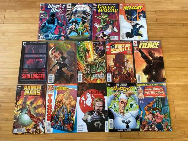 Lot of 14 Comics Some vintage, some modern Wonder-Man RAI And The Future Force Green Arrow Hellcat Skulldigger Kato Infinite Crisis Whistling Skull Fierce Armor Wars Shadowman James Bond Felix...