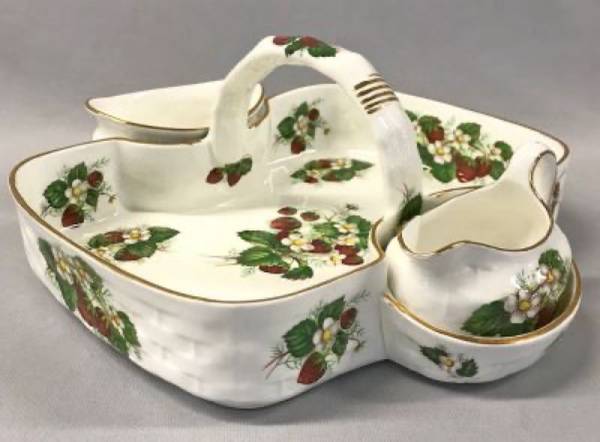 Hammersley & Co. Strawberry Ripe bone china tea basket set, which includes a basket tray, creamer, and sugar bowl.
