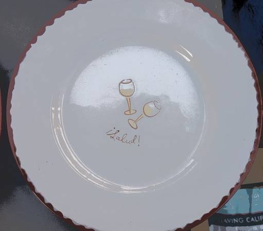 The design on the plates have two wine glasses hand painted in yellow lettering.