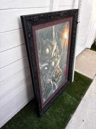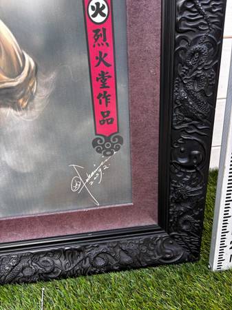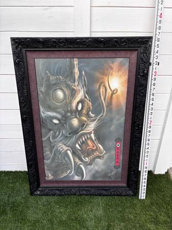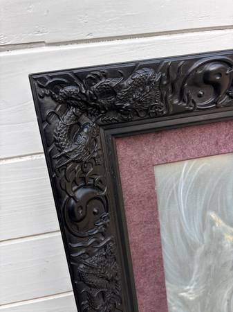 Black wood frame with dragons and yin yang symbols carved in. painting of a Chinese dragon. The artwork features a detailed, monstrous dragon with a menacing expression and prominent claws, set against a cloudy background with a bright light source. Large format 43.5" tall x 31.5" wide. Ready to wall hang.