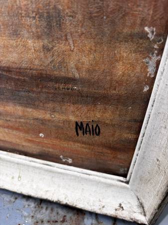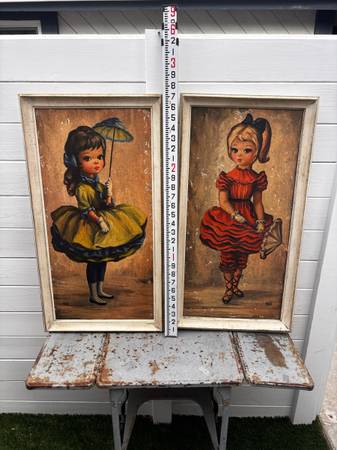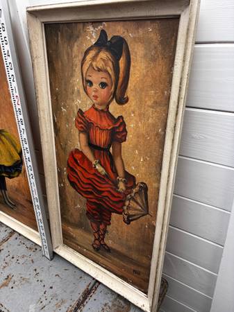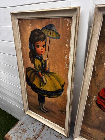 2 mcm mid century modern prints big eyes by Maio, Bloomer girl and high button shoes. 33" x 17" framed size. Ready to wall hang. Like Margaret Kean. Have some damage, see photos. Sold as is. Both pieces for one price.