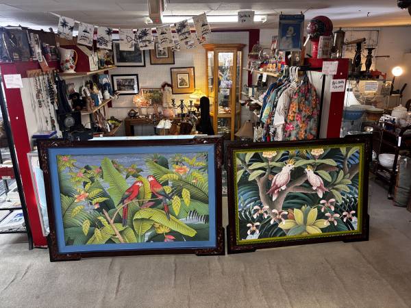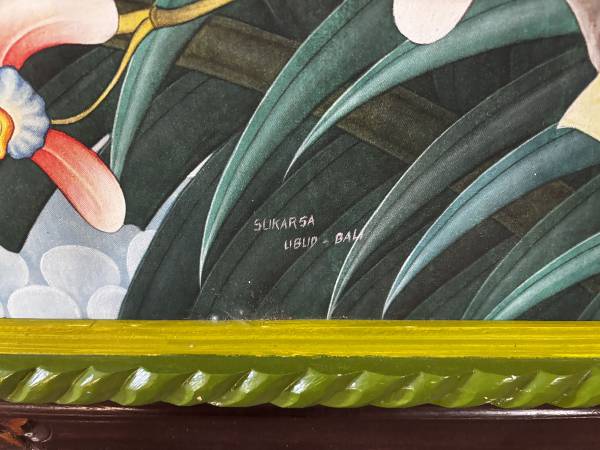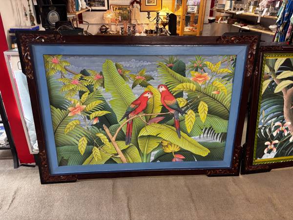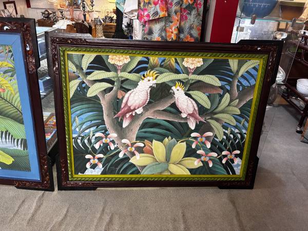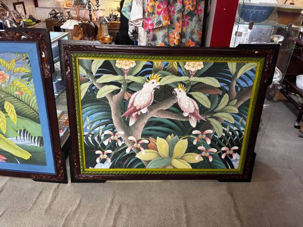 Original Balinese painting wall art, likely from the Ubud area of Bali, Indonesia. The painting depicts two parrots in a lush, tropical jungle scene with large leaves and flowers. 60" x 42". ready to wall hang. 2 available priced individually.